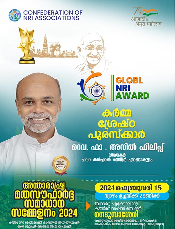 Fr. Anil Philip CMI has been awarded the esteemed Confederation of NRI Associations Global NRI Award for Peace and Tolerance, acknowledging his outstanding efforts in promoting interreligious activities. Through his dedicated work, he has facilitated meaningful dialogue and collaboration among various faith communities, fostering a spirit of unity and mutual respect. As the recipient of this prestigious honor, Fr. Anil Philip's commitment to peace and tolerance shines brightly, serving as an inspiration to individuals and organizations worldwide. His tireless dedication to promoting understanding and harmony among people of different backgrounds has left an indelible mark on the global community
